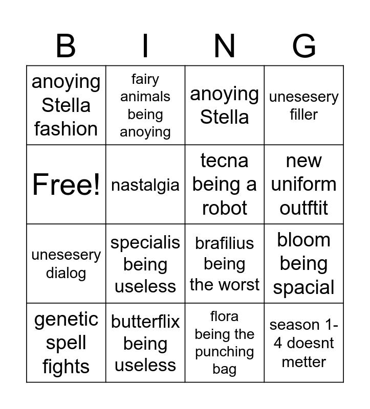 This bingo card has 16 words: butterflix being useless, bloom being spacial, anoying Stella, anoying Stella fashion, unesesery dialog, fairy animals being anoying, brafilius being the worst, flora being the punching bag, Free!, nastalgia, genetic spell fights, unesesery filler, specialis being useless, new uniform outftit, tecna being a robot and season 1-4 doesnt metter.