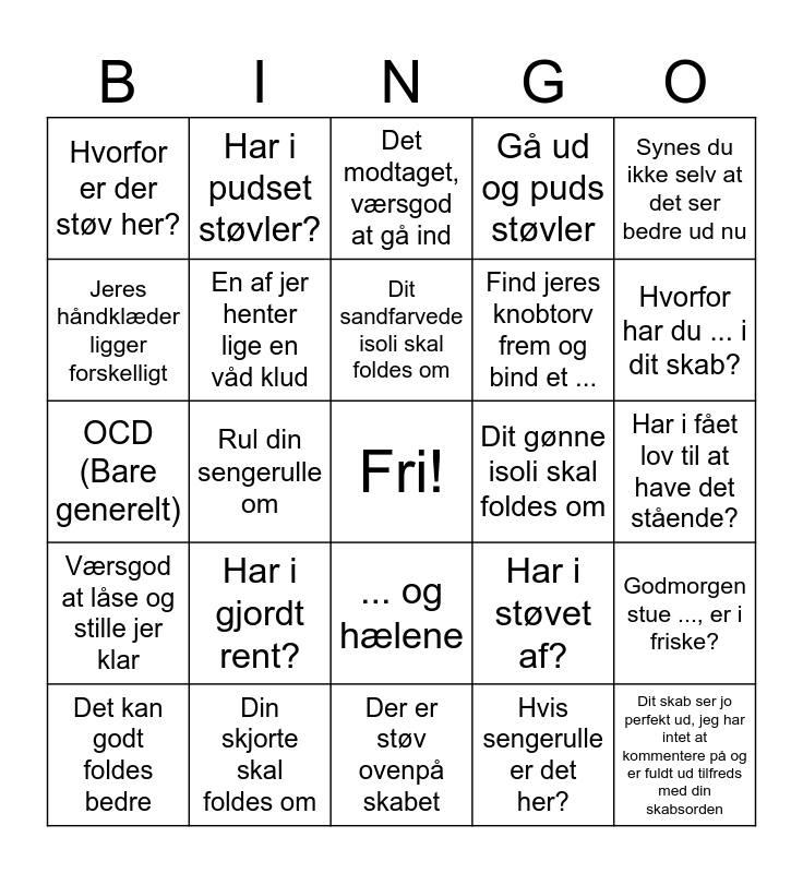 This bingo card has a free space and 24 words: Har i gjordt rent?, Din skjorte skal foldes om, Dit sandfarvede isoli skal foldes om, Det kan godt foldes bedre, Synes du ikke selv at det ser bedre ud nu, Hvorfor er der støv her?, Jeres håndklæder ligger forskelligt, Har i pudset støvler?, Dit gønne isoli skal foldes om, ... og hælene, Find jeres knobtorv frem og bind et ..., OCD (Bare generelt), Har i støvet af?, Godmorgen stue ..., er i friske?, En af jer henter lige en våd klud, Hvis sengerulle er det her?, Har i fået lov til at have det stående?, Det modtaget, værsgod at gå ind, Hvorfor har du ... i dit skab?, Rul din sengerulle om, Dit skab ser jo perfekt ud, jeg har intet at kommentere på og er fuldt ud tilfreds med din skabsorden, Værsgod at låse og stille jer klar, Gå ud og puds støvler and Der er støv ovenpå skabet.