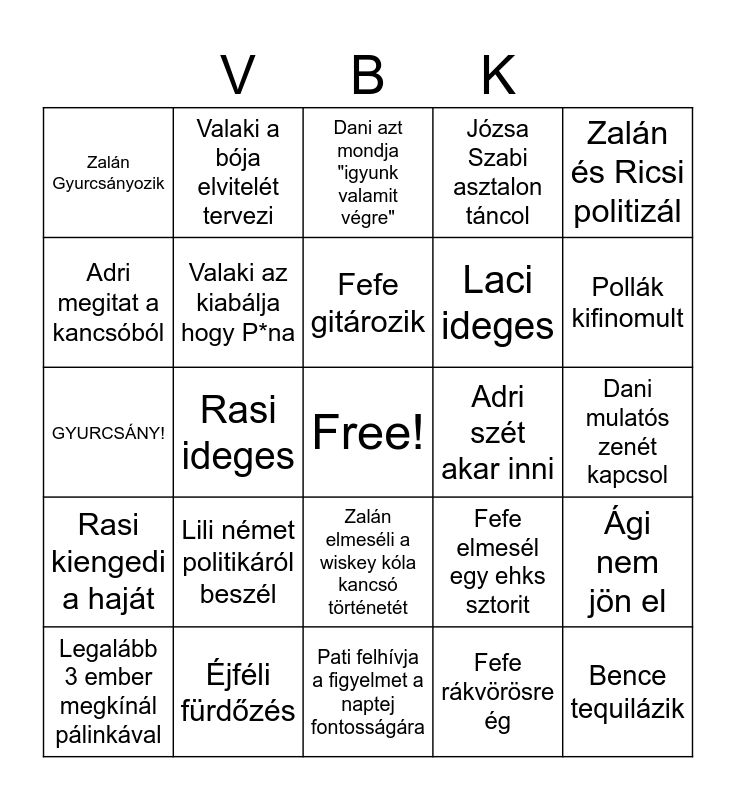 This bingo card has a free space and 39 words: A fehér pad bekerül a balatonba, Szedd aláá!, Cicaaa, Valaki az kiabálja hogy P*na, Legalább 3 ember megkínál pálinkával, Zalán elmeséli a wiskey kóla kancsó történetét, Fefe gitározik, Zalán meghív egy unicumra, Zalán és Ricsi politizál, Rasi kiengedi a haját, Rasi ideges, Józsa Szabi asztalon táncol, Bence tequilázik, Dani mulatós zenét kapcsol, Adri szét akar inni, Lili német politikáról beszél, Csongi megsért valakit, Zalán Gyurcsányozik, Nati bundásról mutat képet, Fefe elmesél egy ehks sztorit, Adri megitat a kancsóból, Pati felhívja a figyelmet a naptej fontosságára, Laci ideges, Pollák kifinomult, Pálinka, Csongi politizál, Ricsi hányószünetet tart, Andris berakja a Háromszort, Dani cigit tarhál, Valaki a bója elvitelét tervezi, Nati elbújik Szotyival telefonálni, Kornél pálinkával kínál, Dani azt mondja "igyunk valamit végre", Éjféli fürdőzés, Fefe rákvörösre ég, Bazsó hot, Ági nem jön el, GYURCSÁNY! and Meg"kacsintanak" valakit.