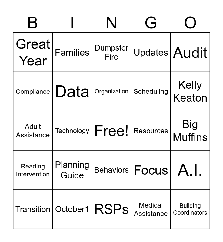 This bingo card has a free space and 39 words: MDOIEP, Dr Lawson, Barb James, Data, Transition, Behaviors, Organization, Meeting Invitations, Audit, Reading Intervention, Technology, Updates, Building Coordinators, Big Muffins, Resources, Planning Guide, New Teachers, Great Year, Support, Focus, Compliance, RSPs, Scheduling, Kelly Keaton, Wow!, Value, Encourage, SECAC, Autism, Families, Psychologists, Shortage, Dumpster Fire, October1, Medical Assistance, Football, A.I., Adult Assistance and Practice Profile.