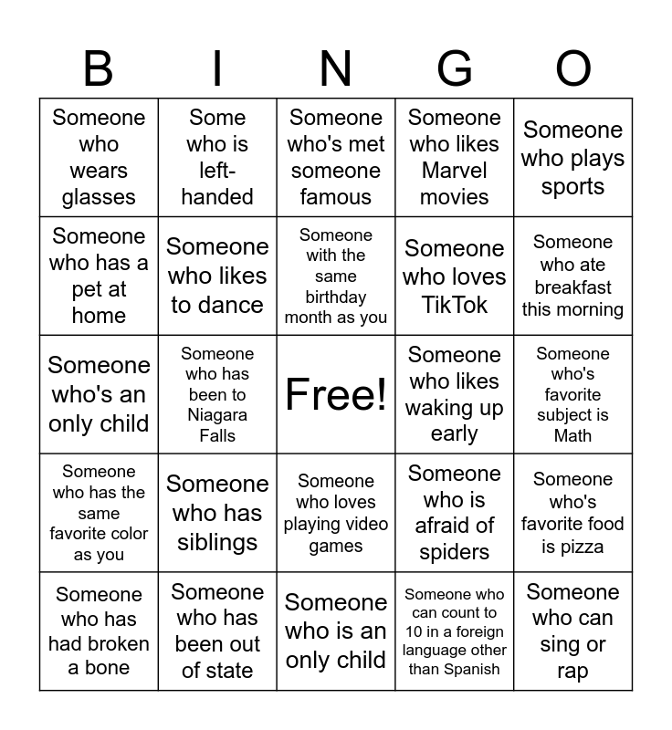This bingo card has a free space and 24 words: Someone who has siblings, Someone who has been out of state, Someone with the same birthday month as you, Someone who has had broken a bone, Someone who plays sports, Someone who wears glasses, Someone who has a pet at home, Some who is left-handed, Someone who likes waking up early, Someone who loves playing video games, Someone who loves TikTok, Someone who's an only child, Someone who is afraid of spiders, Someone who's favorite food is pizza, Someone who likes to dance, Someone who can count to 10 in a foreign language other than Spanish, Someone who's favorite subject is Math, Someone who's met someone famous, Someone who ate breakfast this morning, Someone who has been to Niagara Falls, Someone who can sing or rap, Someone who has the same favorite color as you, Someone who likes Marvel movies and Someone who is an only child.