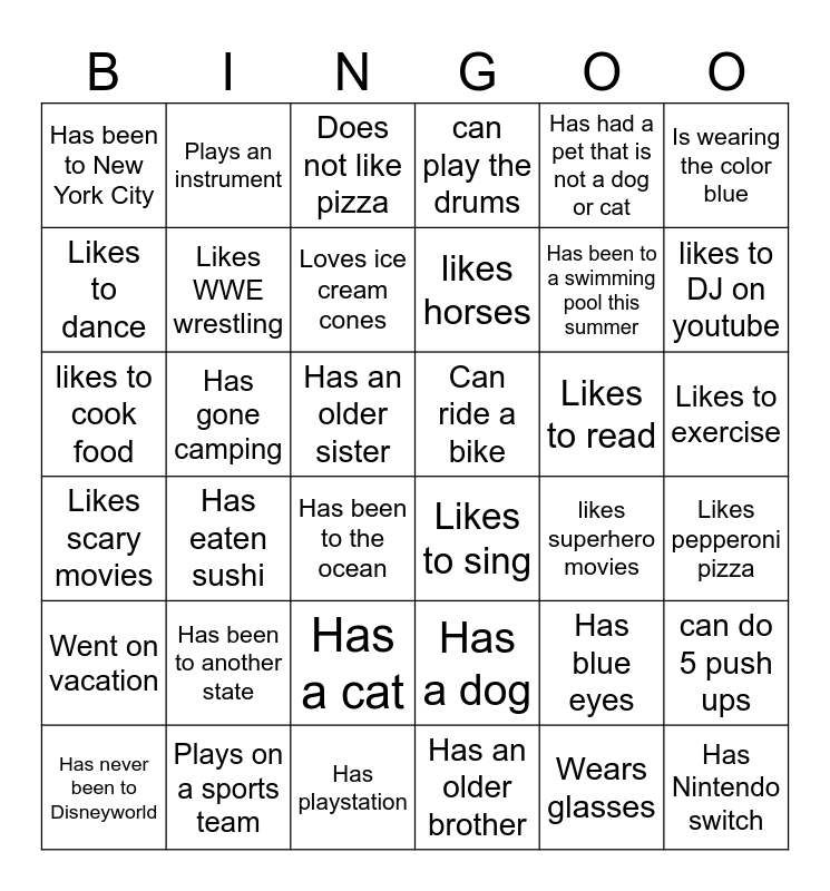 This bingo card has 36 words: Has a dog, Has a cat, Has an older brother, Likes to dance, Likes scary movies, Can ride a bike, Likes WWE wrestling, Has playstation, Has had a pet that is not a dog or cat, Has blue eyes, likes to DJ on youtube, can play the drums, can do 5 push ups, Has gone camping, likes horses, Has been to New York City, Went on vacation, Likes to read, likes to cook food, Does not like pizza, Has an older sister, Has eaten sushi, Likes to sing, Has been to the ocean, likes superhero movies, Plays an instrument, Has been to a swimming pool this summer, Plays on a sports team, Loves ice cream cones, Is wearing the color blue, Has Nintendo switch, Has never been to Disneyworld, Likes pepperoni pizza, Likes to exercise, Has been to another state and Wears glasses.