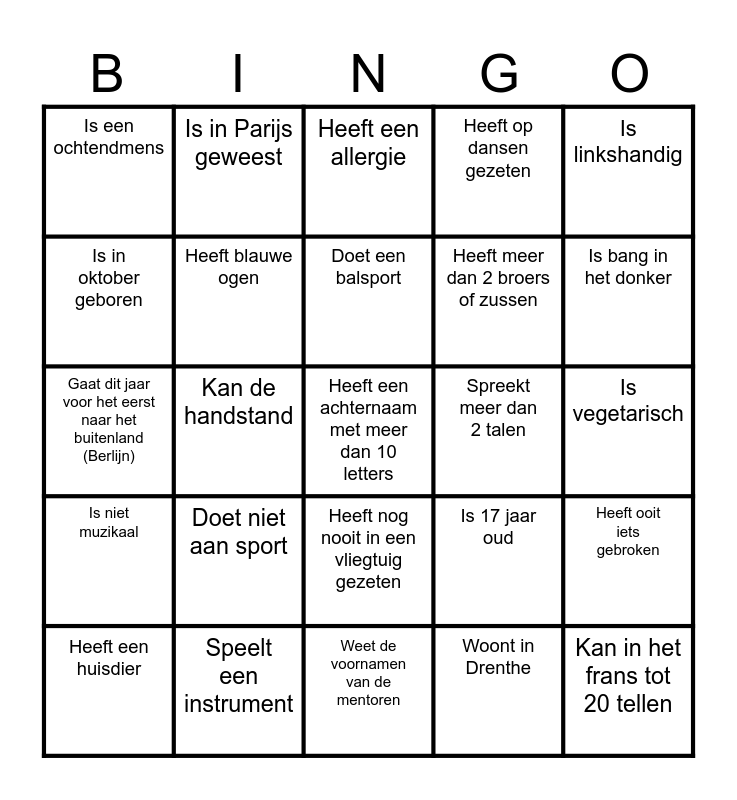 This bingo card has a free space and 24 words: Doet niet aan sport, Speelt een instrument, Doet een balsport, Heeft een huisdier, Is linkshandig, Is een ochtendmens, Is in oktober geboren, Is in Parijs geweest, Spreekt meer dan 2 talen, Heeft nog nooit in een vliegtuig gezeten, Heeft meer dan 2 broers of zussen, Gaat dit jaar voor het eerst naar het buitenland (Berlijn), Is 17 jaar oud, Heeft ooit iets gebroken, Heeft blauwe ogen, Woont in Drenthe, Is vegetarisch, Heeft een allergie, Is bang in het donker, Kan de handstand, Kan in het frans tot 20 tellen, Is niet muzikaal, Heeft op dansen gezeten and Weet de voornamen van de mentoren.