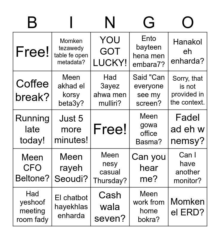 This bingo card has a free space and 24 words: Meen rayeh Seoudi?, El chatbot hayekhlas enharda, Had 3ayez ahwa men mulliri?, Had yeshoof meeting room fady, Hanakol eh enharda?, Free!, Coffee break?, Momken tezawedy table fe open metadata?, Meen gowa office Basma?, Meen nesy casual Thursday?, Said "Can everyone see my screen?, Running late today!, Can you hear me?, Can I have another monitor?, Meen akhad el korsy beta3y?, Meen work from home bokra?, Fadel ad eh w nemsy?, YOU GOT LUCKY!, Sorry, that is not provided in the context., Just 5 more minutes!, Momken el ERD?, Meen CFO Beltone?, Ento bayteen hena men embara7? and Cash wala seven?.