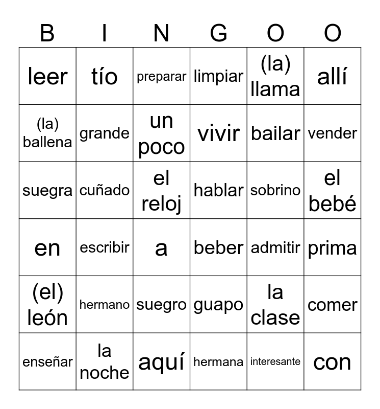 This bingo card has 91 words: Free!, el/la amigo, amiga, el bebé, el hombre, la mujer, la niña, chica, el niño, chico, la clase, el día, la escuela, la fiesta, el libro, la noche, el reloj, bueno, grande, guapo, interesante, malo, pequeño, rígido, simpático, admitir, aprender, bailar, beber, caminar, comer, comprar, correr, enseñar, escribir, ganar (un partido), hablar, leer, limpiar, preparar, trabajar, vender, vivir, a, allí, aquí, con, después, en, mucho, no, sí, sin, también, un poco, y and, abuelo, abuela, cuñada, cuñado, esposa, esposo, hermana, hermano, hija, hijo, madre, nieta, nieto, padre, prima, primo, sobrina, sobrino, suegra, suegro, tía, tío, (la) ballena, (el) caballo, (la) cebra, (el) gato, (la) jirafa, (el) león, (la) llama, (el) oso, (el) pájaro, (el) perro, (el) pez, (la) rana, (el) ratón, (la) serpiente, (el) tigre and (la) vaca.