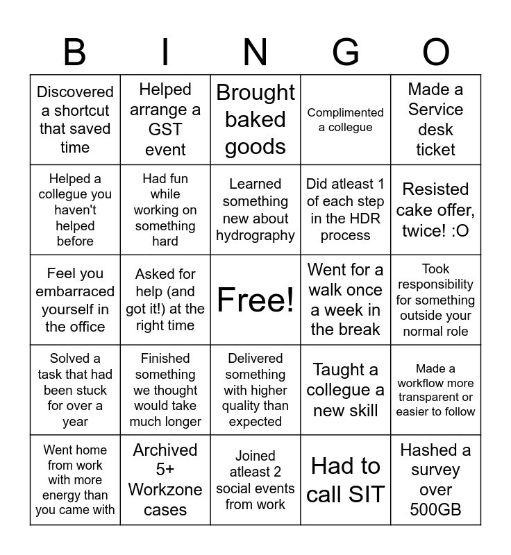 This bingo card has a free space and 24 words: Finished something we thought would take much longer, Archived 5+ Workzone cases, Learned something new about hydrography, Went home from work with more energy than you came with, Made a Service desk ticket, Discovered a shortcut that saved time, Helped a collegue you haven't helped before, Helped arrange a GST event, Went for a walk once a week in the break, Delivered something with higher quality than expected, Did atleast 1 of each step in the HDR process, Feel you embarraced yourself in the office, Taught a collegue a new skill, Made a workflow more transparent or easier to follow, Had fun while working on something hard, Had to call SIT, Took responsibility for something outside your normal role, Brought baked goods, Resisted cake offer, twice! :O, Asked for help (and got it!) at the right time, Hashed a survey over 500GB, Solved a task that had been stuck for over a year, Complimented a collegue and Joined atleast 2 social events from work.