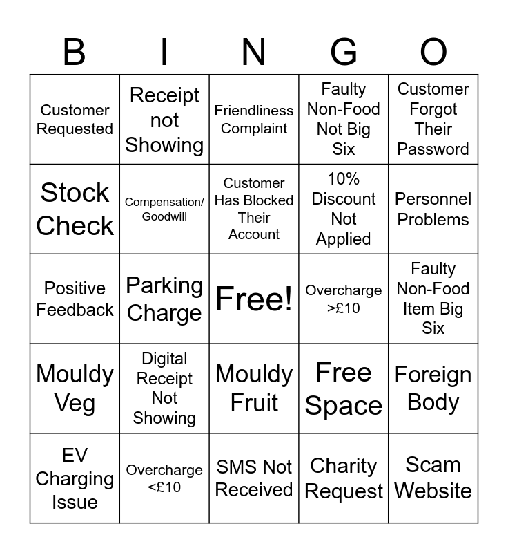 This bingo card has a free space and 26 words: Mouldy Veg, Overcharge <£10, Customer Has Blocked Their Account, Charity Request, Customer Forgot Their Password, Customer Requested, Compensation/ Goodwill, Friendliness Complaint, 10% Discount Not Applied, Scam Website, Stock Check, Parking Charge, SPAM, Free Space, Faulty Non-Food Item Big Six, Free Bakery Item Not Applied, Receipt not Showing, Mouldy Fruit, Faulty Non-Food Not Big Six, Foreign Body, Positive Feedback, Digital Receipt Not Showing, SMS Not Received, Overcharge >£10, Personnel Problems and EV Charging Issue.