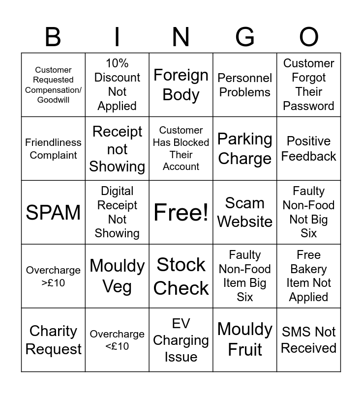 This bingo card has a free space and 24 words: Mouldy Veg, Overcharge <£10, Customer Has Blocked Their Account, Charity Request, Customer Forgot Their Password, Customer Requested Compensation/ Goodwill, Friendliness Complaint, 10% Discount Not Applied, Scam Website, Stock Check, Parking Charge, SPAM, Faulty Non-Food Item Big Six, Free Bakery Item Not Applied, Receipt not Showing, Mouldy Fruit, Faulty Non-Food Not Big Six, Foreign Body, Positive Feedback, Digital Receipt Not Showing, SMS Not Received, Overcharge >£10, Personnel Problems and EV Charging Issue.