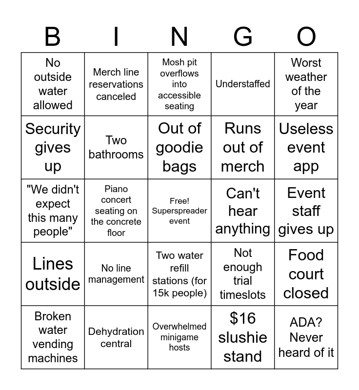 This bingo card has a free space and 24 words: No line management, Dehydration central, Out of goodie bags, Broken water vending machines, Worst weather of the year, No outside water allowed, Security gives up, Merch line reservations canceled, Can't hear anything, Two water refill stations (for 15k people), Runs out of merch, "We didn't expect this many people", Not enough trial timeslots, Food court closed, Two bathrooms, $16 slushie stand, Event staff gives up, Mosh pit overflows into accessible seating, Useless event app, Piano concert seating on the concrete floor, ADA? Never heard of it, Lines outside, Understaffed and Overwhelmed minigame hosts.