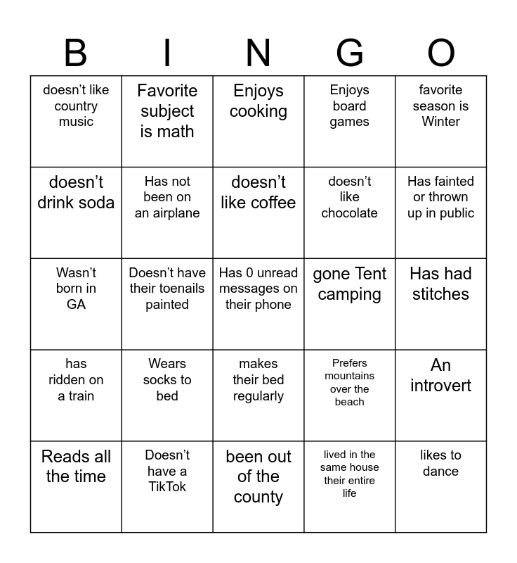This bingo card has 25 words: Wears socks to bed, been out of the county, doesn’t like coffee, Reads all the time, favorite season is Winter, doesn’t like country music, doesn’t drink soda, Favorite subject is math, gone Tent camping, makes their bed regularly, doesn’t like chocolate, Wasn’t born in GA, Prefers mountains over the beach, An introvert, Has not been on an airplane, likes to dance, Has had stitches, Enjoys cooking, Has fainted or thrown up in public, Doesn’t have their toenails painted, Has 0 unread messages on their phone, Doesn’t have a TikTok, has ridden on a train, Enjoys board games and lived in the same house their entire life.