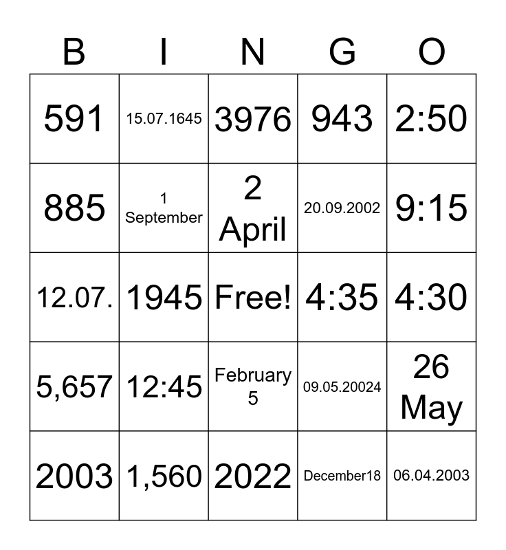 This bingo card has a free space and 24 words: 12:45, 1,560, 2 April, 2003, 2:50, 591, 885, 15.07.1645, 4:35, February 5, 20.09.2002, 12.07., 09.05.20024, 26 May, 1 September, December18, 4:30, 3976, 9:15, 1945, 06.04.2003, 5,657, 943 and 2022.