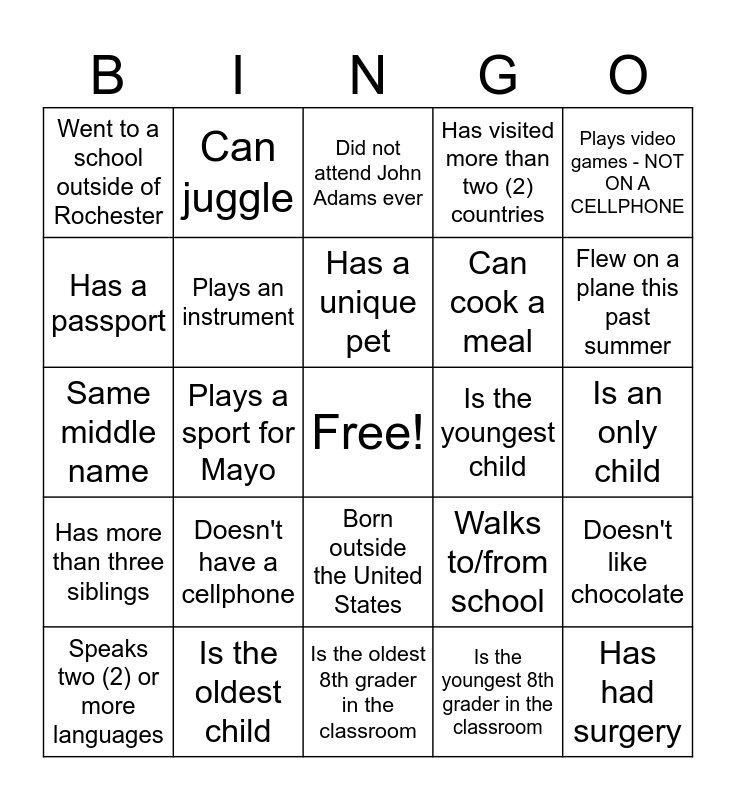 This bingo card has a free space and 29 words: Speaks two (2) or more languages, Plays a sport for John Marshall, Plays a sport for Mayo, Plays a sport for Century, Went to a school outside of Rochester, Did not attend John Adams ever, Plays an instrument, Doesn't have a cellphone, Is the youngest child, Is the oldest child, Is an only child, Has had surgery, Is the oldest 8th grader in the classroom, Is the youngest 8th grader in the classroom, Flew on a plane this past summer, Can do a cartwheel, Born outside the United States, Has more than three siblings, Plays video games - NOT ON A CELLPHONE, Same middle name, Walks to/from school, Does your own laundry, Can cook a meal, Has a passport, Has visited more than two (2) countries, Can juggle, Doesn't like chocolate, Has a unique pet and Has a dog or cat.