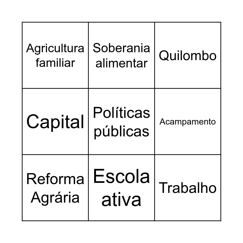 This bingo card has 31 words: Free!, Educação do campo, Agroecologia, Comunidade, Agricultura familiar, Quilombo, Reforma Agrária, MST, Escola Família Agrícola, Pedagogia da Alternância, Conhecimentos, Camponeses, Direito à educação, Democracia, Direitos humanos, Educação popular, Escola do campo, Infância, Mística, Ocupação, Políticas públicas, Povos indígenas, Comunidades tradicionais, Soberania alimentar, Trabalho, Acampamento, Capital, Agronegócio, EJA, Escola ativa and Escola itinerante.