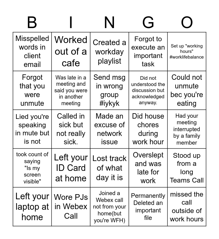 This bingo card has a free space and 24 words: Left your laptop at home, Left your ID Card at home, Send msg in wrong group #iykyk, Permanently Deleted an important file, Set up "working hours" #worklifebalance, Misspelled words in client email, Worked out of a cafe, Created a workday playlist, Did house chores during work hour, Had your meeting interrupted by a family member, Lied you're speaking in mute but is not, Was late in a meeting and said you were in another meeting, Overslept and was late for work, Stood up from a long Teams Call, Forgot that you were unmute, Wore PJs in Webex Call, Joined a Webex call not from your home(but you're WFH), Forgot to execute an important task, Could not unmute bec you're eating, took count of saying "Is my screen visible", Called in sick but not really sick., Lost track of what day it is, Did not understood the discussion but acknowledged anyway. and missed the call outside of work hours.