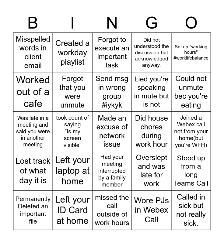 This bingo card has a free space and 24 words: Left your laptop at home, Left your ID Card at home, Send msg in wrong group #iykyk, Permanently Deleted an important file, Set up "working hours" #worklifebalance, Misspelled words in client email, Worked out of a cafe, Created a workday playlist, Did house chores during work hour, Had your meeting interrupted by a family member, Lied you're speaking in mute but is not, Was late in a meeting and said you were in another meeting, Overslept and was late for work, Stood up from a long Teams Call, Forgot that you were unmute, Wore PJs in Webex Call, Joined a Webex call not from your home(but you're WFH), Forgot to execute an important task, Could not unmute bec you're eating, took count of saying "Is my screen visible", Called in sick but not really sick., Lost track of what day it is, Did not understood the discussion but acknowledged anyway. and missed the call outside of work hours.
