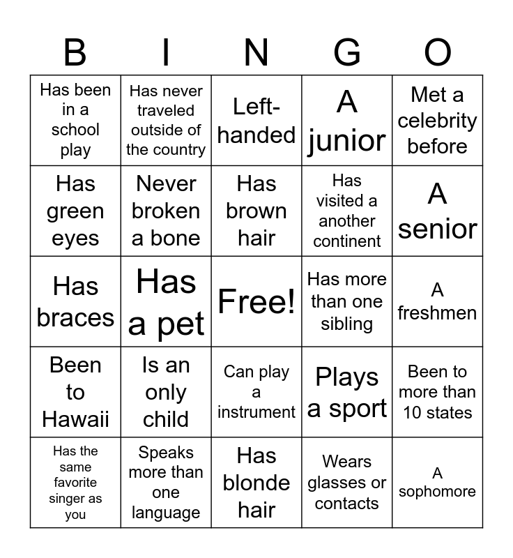 This bingo card has a free space and 24 words: Is an only child, Speaks more than one language, Has brown hair, Has the same favorite singer as you, Met a celebrity before, Has been in a school play, Has green eyes, Has never traveled outside of the country, Has more than one sibling, Can play a instrument, Has visited a another continent, Has braces, Plays a sport, Been to more than 10 states, Never broken a bone, Wears glasses or contacts, A freshmen, Left-handed, A senior, Has a pet, A sophomore, Been to Hawaii, A junior and Has blonde hair.