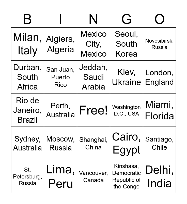 This bingo card has a free space and 25 words: Sydney, Australia, Lima, Peru, Vancouver, Canada, Kinshasa, Democratic Republic of the Congo, Novosibirsk, Russia, Milan, Italy, Algiers, Algeria, Mexico City, Mexico, Washington D.C., USA, Santiago, Chile, Durban, South Africa, San Juan, Puerto Rico, Istanbul, Turkey, Cairo, Egypt, London, England, St. Petersburg, Russia, Perth, Australia, Jeddah, Saudi Arabia, Kiev, Ukraine, Miami, Florida, Rio de Janeiro, Brazil, Moscow, Russia, Shanghai, China, Seoul, South Korea and Delhi, India.