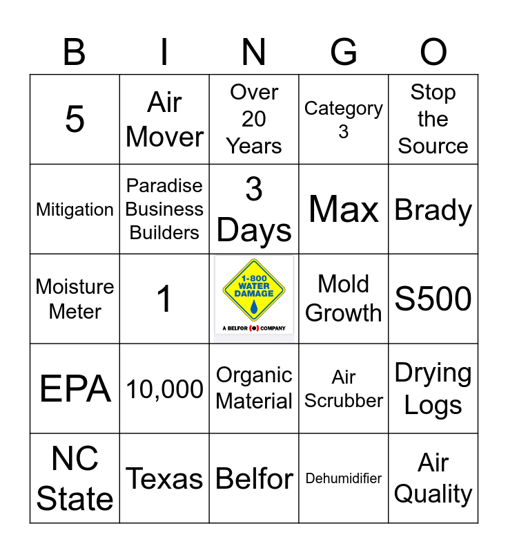 This bingo card has a free space and 24 words: 10,000, Texas, 3 Days, NC State, Stop the Source, 5, Mitigation, Air Mover, Mold Growth, Organic Material, Max, Moisture Meter, Air Scrubber, Drying Logs, Paradise Business Builders, Dehumidifier, S500, Over 20 Years, Brady, 1, Air Quality, EPA, Category 3 and Belfor.