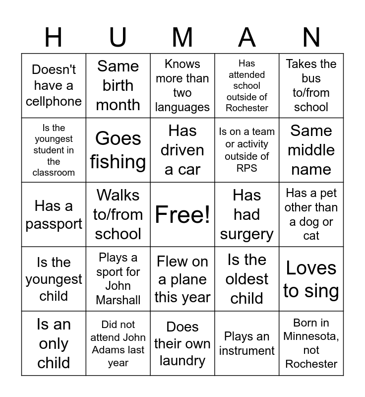 This bingo card has a free space and 43 words: Will audition for the fall play, Born in Minnesota, not Rochester, Born outside the United States, Is an only child, Has more than two siblings, Plays an instrument, Knows more than two languages, Walks to/from school, Takes the bus to/from school, Did not attend John Adams last year, Has attended school outside of Rochester, Has had surgery, Flew on a plane this year, Plays a sport for John Marshall, Plays a sport for Mayo, Does their own laundry, Doesn't know how to swim, Has a passport, Has been to more than two other countries (Not USA), Same middle name, Same birth month, Can cook a meal, Plays video games, not on their cellphone, Doesn't have a cellphone, Has a dog or cat, Has a pet other than a dog or cat, Can juggle, Can do a cartwheel, Is the oldest child, Is the youngest child, Doesn't like sports, Loves to sing, Loves to read, Walks to/from school, Has a paying job, Traveled outside of Minnesota this summer, Has been on a boat, Has driven a car, Is the youngest student in the classroom, Is on a team or activity outside of RPS, Goes hunting, Goes fishing and Loves to dance.