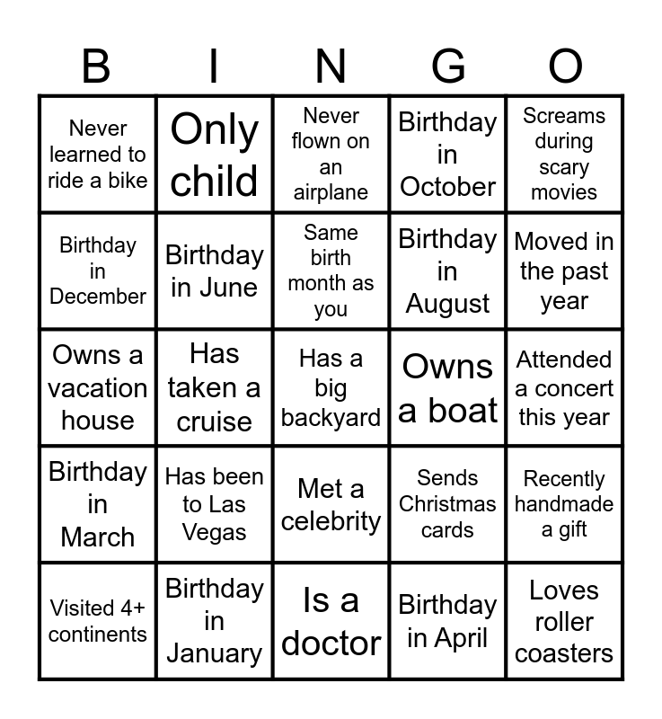 This bingo card has 61 words: Free!, Birthday in January, Birthday in February, Birthday in March, Birthday in April, Birthday in May, Birthday in June, Birthday in July, Birthday in August, Birthday in September, Birthday in October, Birthday in November, Birthday in December, Plays an instrument, Traveled in the last year, Never learned to ride a bike, Has a big backyard, Screams during scary movies, Has a phobia, Same birth month as you, Owns a boat, Never flown on an airplane, Visited 4+ continents, Recently handmade a gift, Goes all-out on holiday decorating, Owns same car brand as you, Twin or triplet, Notary public, Moved in the past year, Has performed in public, Drinks 3+ cups of coffee a day, Speaks 2+ languages, Loves karaoke, Invests in the stock market, Only child, Has been skydiving, Received an award, Has taken a cruise, Has never broken a bone, Owns a vacation house, Proposed to spouse in public, Has been to Las Vegas, Attended a concert this year, Has been to California, Sends Christmas cards, Sews, Likes pineapple on pizza, Likes guacamole, Is an educator, Met a celebrity, Is a doctor, Watches documentaries, Know how to can food, Knows martial arts, Loves true crime podcasts, Has been to Puerto Rico, Reads magazines, Has never learned to swim, Creates art, Loves roller coasters and Rides horses.