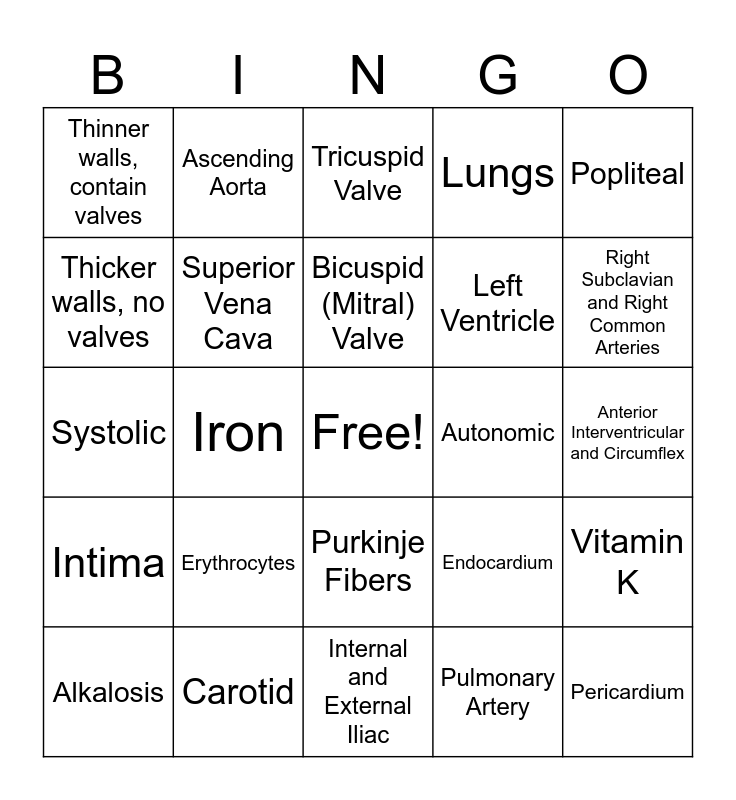 This bingo card has a free space and 32 words: Pulmonary Artery, Pleura, Iron, Increases, Intima, Superior Vena Cava, Popliteal, Vitamin K, Ascending Aorta, Subclavian, Bicuspid (Mitral) Valve, Tricuspid Valve, SA Node, Iliac, Autonomic, Bundle of His, Alkalosis, Systolic, Purkinje Fibers, Erythrocytes, Endocardium, Carry Oxygen, Anterior Interventricular and Circumflex, Carotid, Pericardium, Lungs, Left Ventricle, Thicker walls, no valves, Thinner walls, contain valves, Internal and External Iliac, Tunica Adventitia and Right Subclavian and Right Common Arteries.