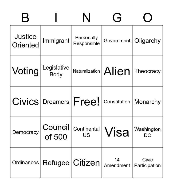 This bingo card has a free space and 24 words: Council of 500, Refugee, Naturalization, Ordinances, Oligarchy, Justice Oriented, Voting, Immigrant, Constitution, Continental US, Alien, Civics, Visa, Washington DC, Legislative Body, 14 Amendment, Monarchy, Personally Responsible, Theocracy, Dreamers, Civic Participation, Democracy, Government and Citizen.