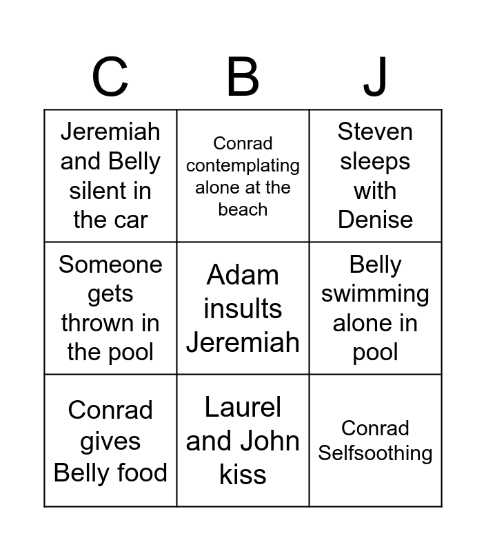 This bingo card has a free space and 8 words: Belly swimming alone in pool, Steven sleeps with Denise, Conrad contemplating alone at the beach, Conrad gives Belly food, Jeremiah and Belly silent in the car, Conrad Selfsoothing, Someone gets thrown in the pool and Laurel and John kiss.