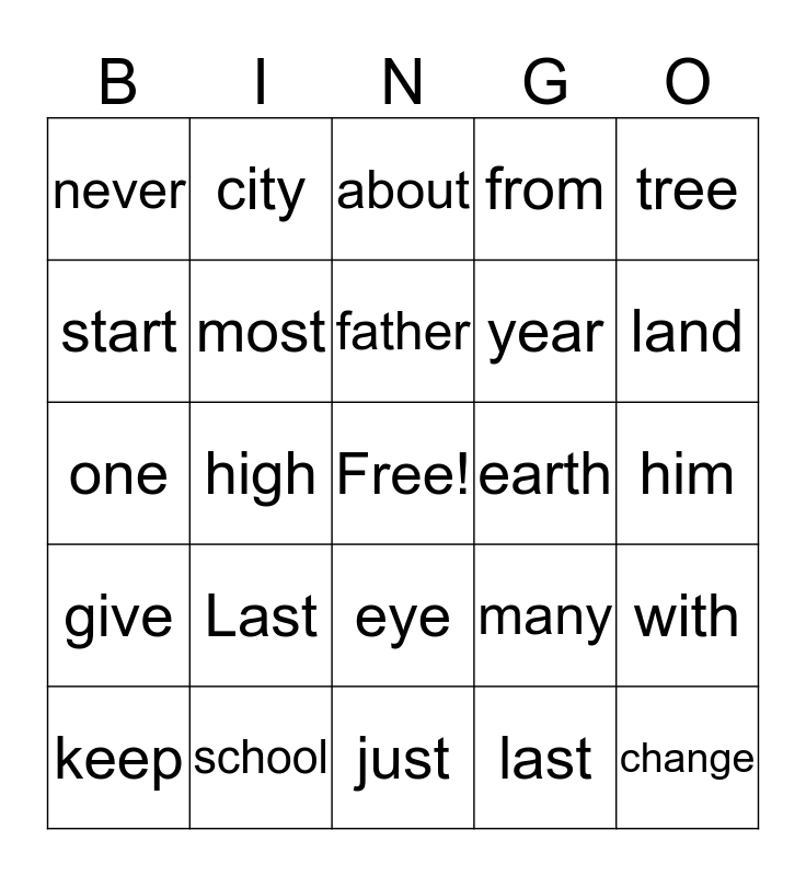 This bingo card has a free space and 24 words: Last, school, father, keep, tree, never, start, city, earth, eye, year, one, many, with, most, last, him, about, land, high, change, give, from and just.