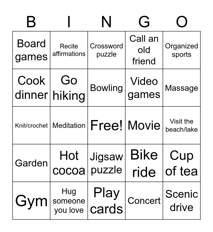 This bingo card has a free space and 35 words: Take a walk, Hot shower or bath, Read a book, Go hiking, Jigsaw puzzle, Call an old friend, Cook dinner, Order food, Bowling, Television, Knit/crochet, Organized sports, Listen to your favorite song, Sketch/color/paint, Board games, Movie, Concert, Meditation, Garden, Scenic drive, Bike ride, Gym, Cup of tea, Hug someone you love, Crossword puzzle, Massage, Bake, Go to bed early, Video games, Visit the beach/lake, Plan your dream vacation, Play cards, Hot cocoa, Recite affirmations and Play a musical instrument.