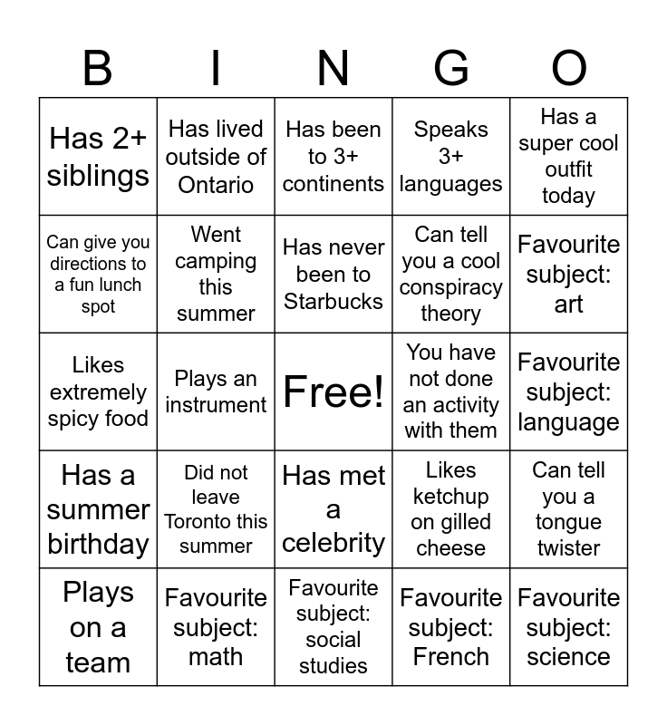 This bingo card has a free space and 29 words: Plays on a team, Plays an individual sport, Plays an instrument, Has a pet, Has 2+ siblings, Has been to 3+ continents, Went camping this summer, Did not leave Toronto this summer, You have not done an activity with them, Favourite subject: math, Favourite subject: language, Favourite subject: science, Favourite subject: social studies, Favourite subject: French, Favourite subject: art, Did bonus work over the summer, Has met a celebrity, Has a summer birthday, Has a super cool outfit today, Likes extremely spicy food, Likes ketchup on gilled cheese, Hates ketchup on grilled cheese, Can tell you a cool conspiracy theory, Can give you directions to a fun lunch spot, Speaks 3+ languages, Has lived outside of Ontario, Can tell you a tongue twister, Has never been to Starbucks and Loves pistachio ice cream.