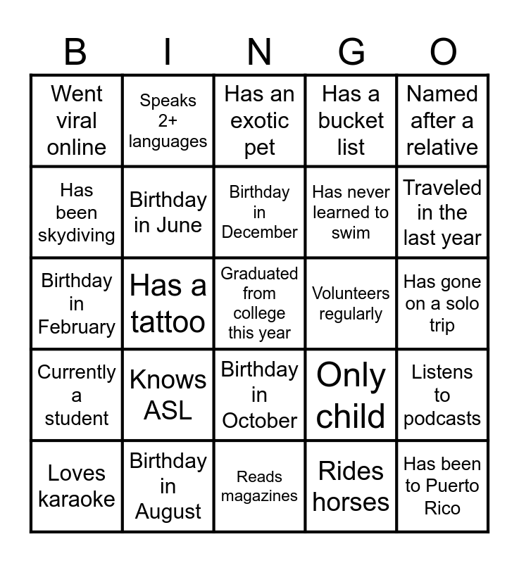 This bingo card has 41 words: Free!, Birthday in February, Birthday in April, Birthday in June, Birthday in August, Birthday in October, Birthday in December, Taught a class, Named after a relative, Currently a student, Has a tattoo, Has a bucket list, Graduated from college this year, Has gone on a solo trip, Volunteers regularly, Knows ASL, Birthday is on a holiday, Went viral online, Has a college degree, Has an exotic pet, Listens to podcasts, Has been to Puerto Rico, Reads magazines, Has never learned to swim, Creates art, Loves roller coasters, Rides horses, Has only one sibling, Traveled in the last year, Been on a bad blind date, Has been to Cancun, Speaks 2+ languages, Loves karaoke, Invests in the stock market, Only child, Has been skydiving, Received an award, Has a phobia, Goes all-out on holiday decorating, Owns same car brand as you and Twin or triplet.