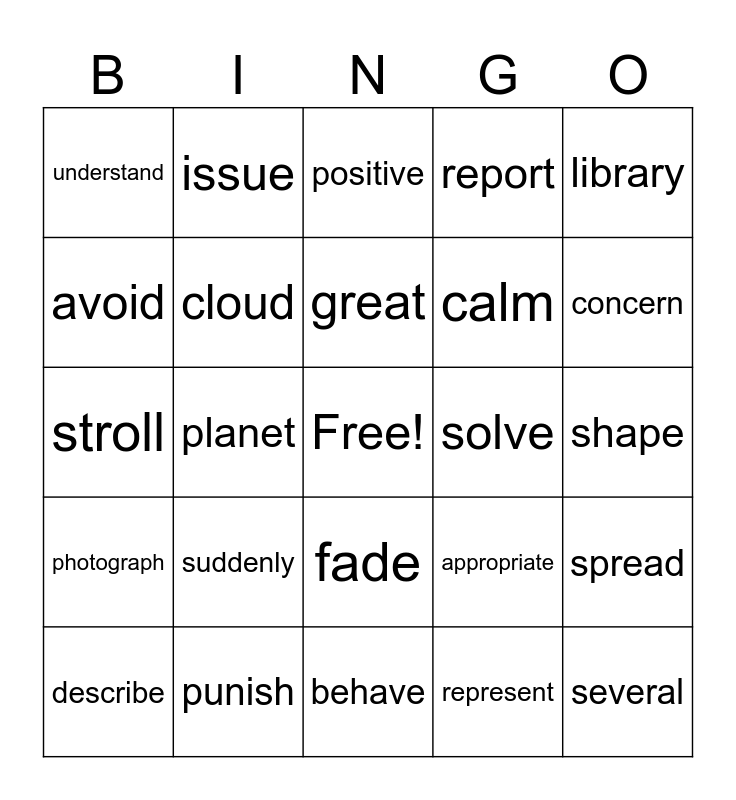 This bingo card has a free space and 39 words: alien, amount, chart, cloud, describe, fade, great, instead, library, photograph, planet, report, several, shape, solve, suddenly, suppose, understand, view, appropriate, avoid, behave, calm, concern, content, expect, frequently, habit, instruct, issue, none, patient, positive, punish, represent, shake, spread, stroll and village.