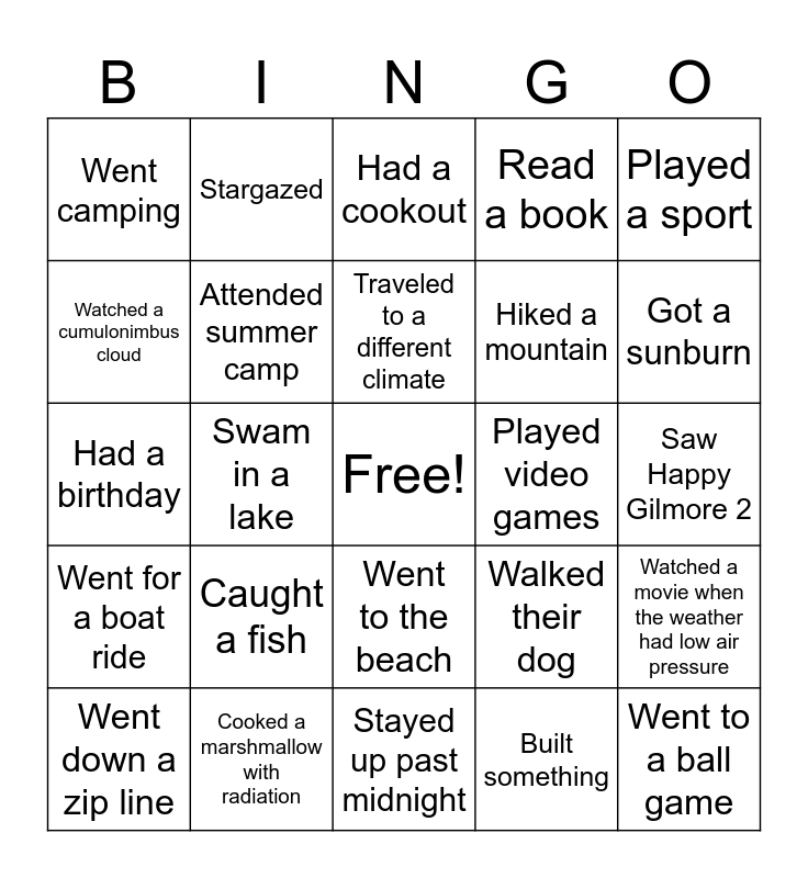 This bingo card has a free space and 24 words: Caught a fish, Cooked a marshmallow with radiation, Traveled to a different climate, Went down a zip line, Played a sport, Went camping, Watched a cumulonimbus cloud, Stargazed, Played video games, Went to the beach, Hiked a mountain, Had a birthday, Walked their dog, Watched a movie when the weather had low air pressure, Attended summer camp, Built something, Saw Happy Gilmore 2, Had a cookout, Got a sunburn, Swam in a lake, Went to a ball game, Went for a boat ride, Read a book and Stayed up past midnight.