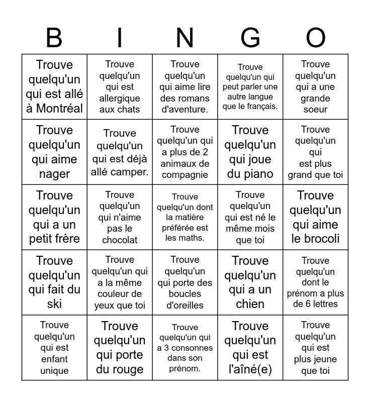 This bingo card has a free space and 24 words: Trouve quelqu'un qui a la même couleur de yeux que toi, Trouve quelqu'un qui porte du rouge, Trouve quelqu'un qui a plus de 2 animaux de compagnie, Trouve quelqu'un qui est enfant unique, Trouve quelqu'un qui a une grande soeur, Trouve quelqu'un qui est allé à Montréal, Trouve quelqu'un qui aime nager, Trouve quelqu'un qui est allergique aux chats, Trouve quelqu'un qui est né le même mois que toi, Trouve quelqu'un qui porte des boucles d'oreilles, Trouve quelqu'un qui joue du piano, Trouve quelqu'un qui a un petit frère, Trouve quelqu'un qui a un chien, Trouve quelqu'un dont le prénom a plus de 6 lettres, Trouve quelqu'un qui est déjà allé camper., Trouve quelqu'un qui est l'aîné(e), Trouve quelqu'un qui aime le brocoli, Trouve quelqu'un qui aime lire des romans d'aventure., Trouve quelqu'un qui est plus grand que toi, Trouve quelqu'un qui n'aime pas le chocolat, Trouve quelqu'un qui est plus jeune que toi, Trouve quelqu'un qui fait du ski, Trouve quelqu'un qui peut parler une autre langue que le français. and Trouve quelqu'un qui a 3 consonnes dans son prénom..