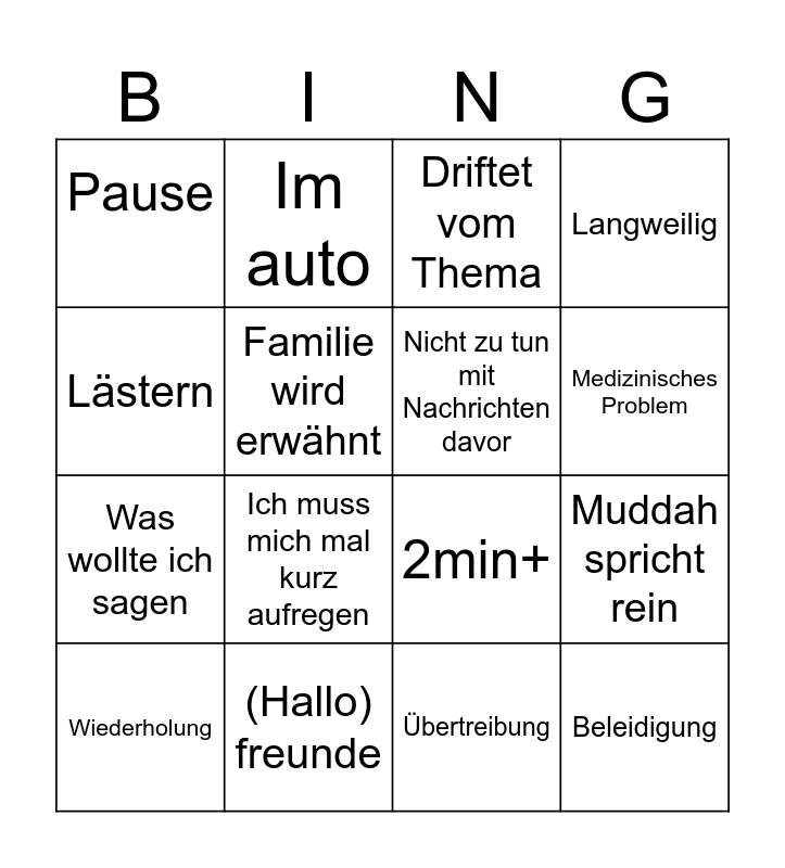 This bingo card has 16 words: (Hallo) freunde, Muddah spricht rein, Driftet vom Thema, Pause, Was wollte ich sagen, Im auto, 2min+, Übertreibung, Lästern, Familie wird erwähnt, Wiederholung, Langweilig, Ich muss mich mal kurz aufregen, Medizinisches Problem, Nicht zu tun mit Nachrichten davor and Beleidigung.