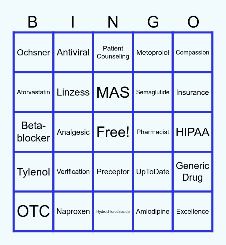 This bingo card has a free space and 59 words: Tamoxifen, Naproxen, Baclofen, Tylenol, Amlodipine, Metformin, Linzess, Jardiance, Semaglutide, Alprazolam, Metoprolol, Losartan, Atorvastatin, Rosuvastatin, Refill Center, Ochsner, Excellence, Compassion, Pharmacy Week, MAS, Pharmacist, Patient Counseling, OTC, Generic Drug, Brand Name Drug, Patient Profile, Prior Authorization, Copay, Insurance, Med Rec, Inventory, Adherence, Compliance, Antibiotic, Antiviral, Antifungal, Corticosteroid, Analgesic, Claritin, Beta-blocker, PPI, Verification, HIPAA, FDA, Black Box Warning, REMS, Compounding, Residency, Preceptor, Hydrochlorothiazide, Levothyroxine, Insulin, PRN, Non-Delegated, DAW, UpToDate, Expired, ASCVD and Formulary.