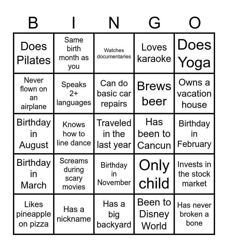 This bingo card has 51 words: Free!, Traveled in the last year, Never learned to ride a bike, Has a big backyard, Screams during scary movies, Has a phobia, Same birth month as you, Owns a boat, Never flown on an airplane, Drinks 3+ cups of coffee a day, Speaks 2+ languages, Loves karaoke, Invests in the stock market, Only child, Collects something, Has a BFF from high school, Can do basic car repairs, Has been to Cancun, Is a nurse, Does Yoga, Knows how to line dance, Been to Disney World, Does Pilates, Brews beer, Has taken a cruise, Has never broken a bone, Owns a vacation house, Has been to California, Likes pineapple on pizza, Watches documentaries, Know how to can food, Knows martial arts, Loves true crime podcasts, Has been to Puerto Rico, Is left-handed, Has a nickname, Has a Masters or PhD, Birthday is on a holiday, Went viral online, Birthday in January, Birthday in February, Birthday in March, Birthday in April, Birthday in May, Birthday in June, Birthday in July, Birthday in August, Birthday in September, Birthday in October, Birthday in November and Birthday in December.
