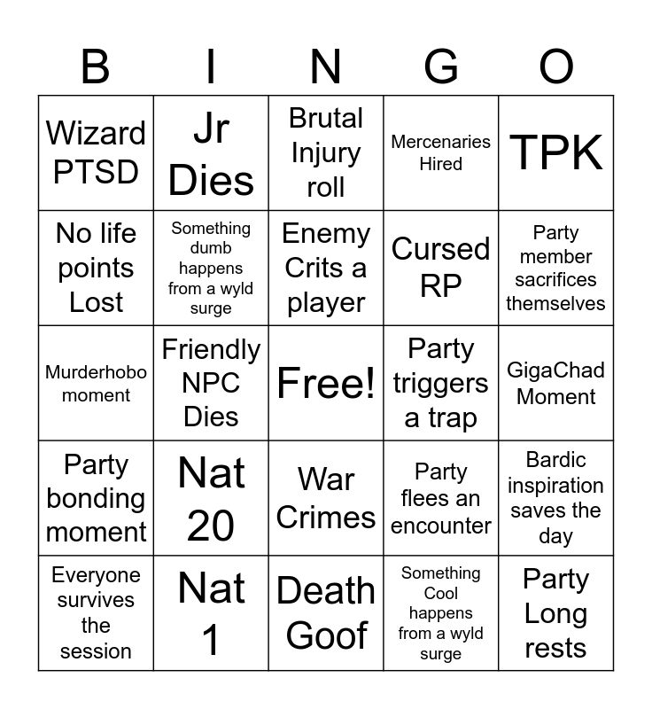 This bingo card has a free space and 24 words: Nat 20, Nat 1, Enemy Crits a player, Everyone survives the session, TPK, Wizard PTSD, No life points Lost, Jr Dies, Party triggers a trap, War Crimes, Cursed RP, Murderhobo moment, Party flees an encounter, Bardic inspiration saves the day, Something dumb happens from a wyld surge, Something Cool happens from a wyld surge, GigaChad Moment, Brutal Injury roll, Party member sacrifices themselves, Friendly NPC Dies, Party Long rests, Party bonding moment, Mercenaries Hired and Death Goof.