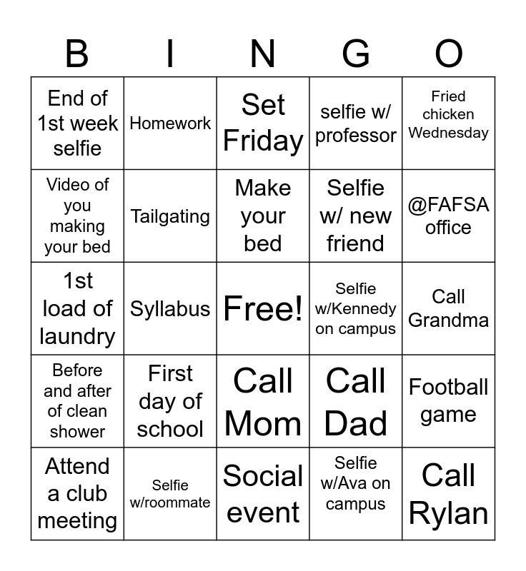 This bingo card has a free space and 24 words: First day of school, Selfie w/roommate, Make your bed, Attend a club meeting, Fried chicken Wednesday, End of 1st week selfie, Video of you making your bed, Homework, Selfie w/Kennedy on campus, Call Mom, Selfie w/ new friend, 1st load of laundry, Call Dad, Football game, Tailgating, Selfie w/Ava on campus, Call Grandma, Set Friday, @FAFSA office, Syllabus, Call Rylan, Before and after of clean shower, selfie w/ professor and Social event.