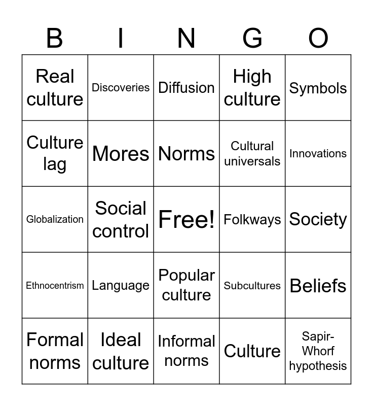 This bingo card has a free space and 28 words: Beliefs, Countercultures, Cultural universals, Culture, Culture lag, Diffusion, Discoveries, Ethnocentrism, Folkways, Formal norms, Globalization, High culture, Ideal culture, Informal norms, Innovations, Inventions, Language, Mores, Norms, Popular culture, Real culture, Sanctions, Sapir-Whorf hypothesis, Social control, Society, Subcultures, Symbols and Values.