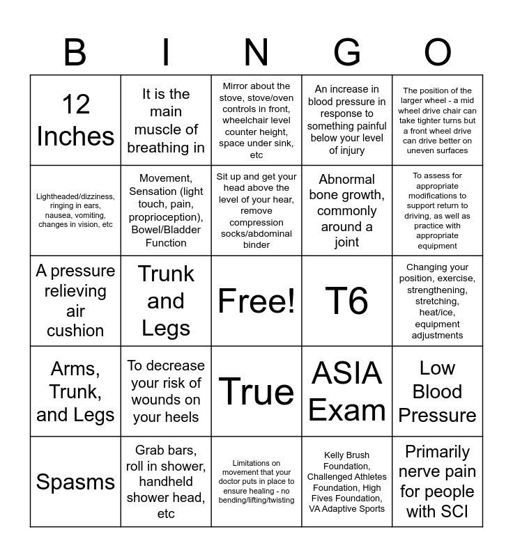 This bingo card has a free space and 35 words: Every 30 Minutes for 2 Minutes, A Lateral or Anterior Lean, or Tilt Back, Every 2 Hours, Movement, Sensation (light touch, pain, proprioception), Bowel/Bladder Function, True, An increase in blood pressure in response to something painful below your level of injury, Lightheaded/dizziness, ringing in ears, nausea, vomiting, changes in vision, etc, Get your head below the level of your heart - tilt back/lean forward in wheelchair, or lay down, Sit up and get your head above the level of your hear, remove compression socks/abdominal binder, A technique for grasping/releasing an object in which a person moves the wrist to open and close the fingers, A pressure relieving air cushion, The position of the larger wheel - a mid wheel drive chair can take tighter turns but a front wheel drive can drive better on uneven surfaces, C3, C4, C5, True - Many people experience a weak cough after an SCI, 12 Inches, T6, Kelly Brush Foundation, Challenged Athletes Foundation, High Fives Foundation, VA Adaptive Sports, Trunk and Legs, Arms, Trunk, and Legs, Primarily nerve pain for people with SCI, ASIA Exam, Spasms, Low Blood Pressure, Grab bars, roll in shower, handheld shower head, etc, Mirror about the stove, stove/oven controls in front, wheelchair level counter height, space under sink, etc, To assess for appropriate modifications to support return to driving, as well as practice with appropriate equipment, False - You can still travel but it may take more thought, time, and coordination, True, Abnormal bone growth, commonly around a joint, Changing your position, exercise, strengthening, stretching, heat/ice, equipment adjustments, Project your kidneys, decrease risk of infection, keep your skin clean and dry, prevent autonomic dysreflexia, Limitations on movement that your doctor puts in place to ensure healing - no bending/lifting/twisting, To decrease your risk of wounds on your heels, It is the main muscle of breathing in and Transportation, ramp access, space, surface, assistance, etc.