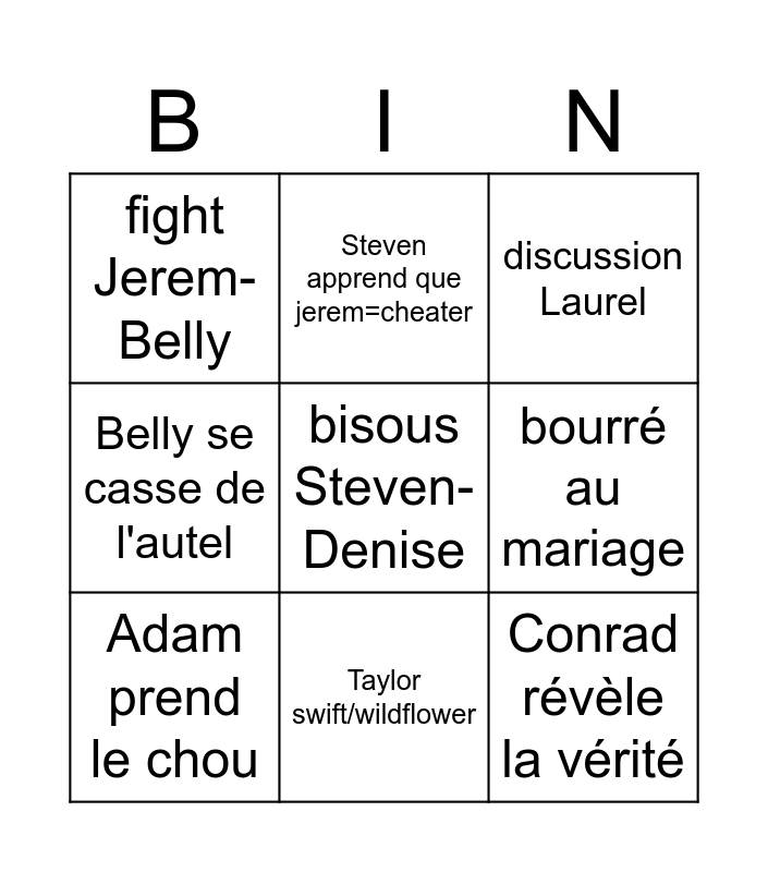 This bingo card has a free space and 8 words: bourré au mariage, discussion Laurel, Steven apprend que jerem=cheater, Adam prend le chou, fight Jerem-Belly, Conrad révèle la vérité, Belly se casse de l'autel and Taylor swift/wildflower.