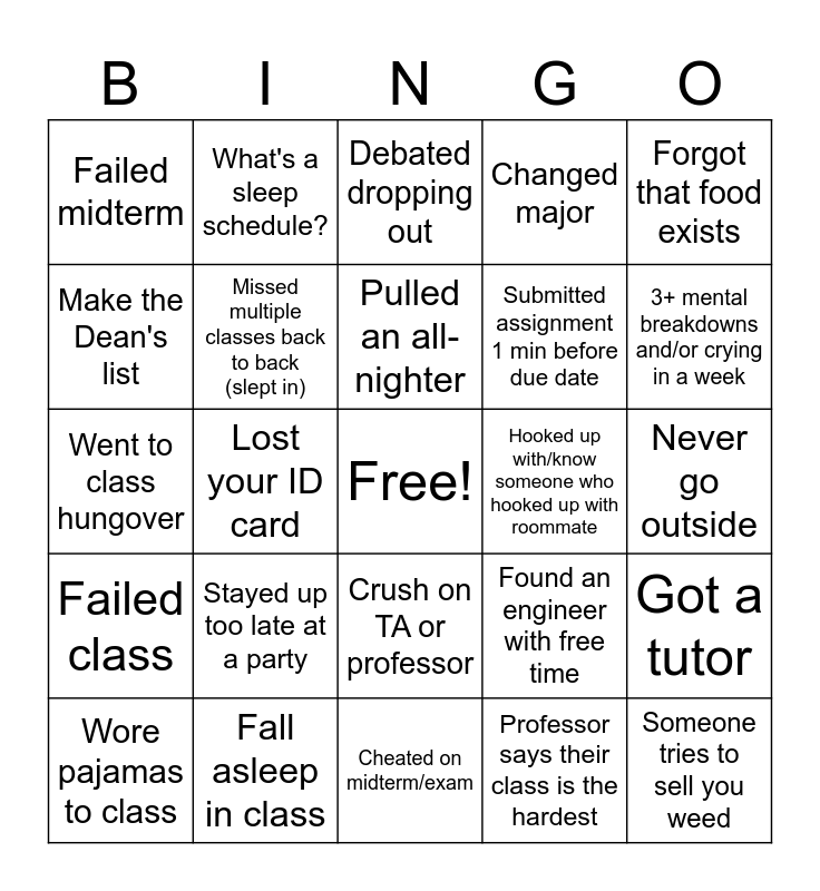 This bingo card has a free space and 24 words: Stayed up too late at a party, Fall asleep in class, Pulled an all-nighter, Wore pajamas to class, Forgot that food exists, Failed midterm, Make the Dean's list, What's a sleep schedule?, Hooked up with/know someone who hooked up with roommate, Crush on TA or professor, Submitted assignment 1 min before due date, Went to class hungover, Found an engineer with free time, Got a tutor, Missed multiple classes back to back (slept in), Professor says their class is the hardest, Never go outside, Debated dropping out, 3+ mental breakdowns and/or crying in a week, Lost your ID card, Someone tries to sell you weed, Failed class, Changed major and Cheated on midterm/exam.