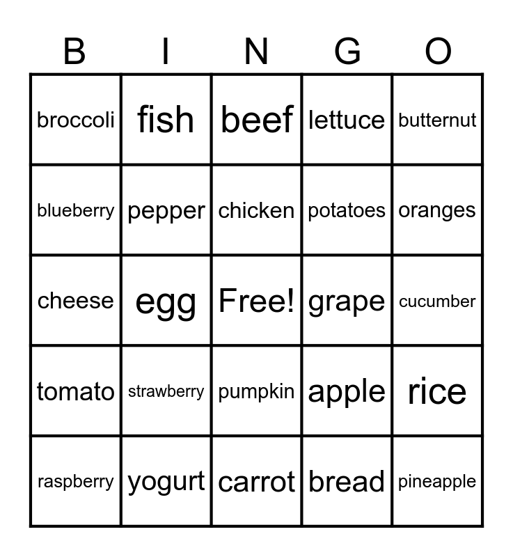 This bingo card has a free space and 27 words: apple, onion, potatoes, carrot, blueberry, beef, fish, tomato, grape, rice, cheese, lettuce, raspberry, yogurt, oranges, milk, pepper, chicken, strawberry, broccoli, cucumber, bread, egg, pineapple, pumpkin, butternut and cabbage.