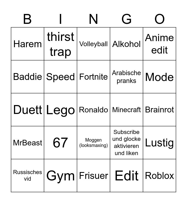 This bingo card has a free space and 24 words: Russisches vid, 67, Fortnite, Edit, Anime edit, Harem, thirst trap, Volleyball, Minecraft, Brainrot, Duett, Speed, Subscribe und glocke aktivieren und liken, Lustig, Baddie, Gym, Frisuer, Alkohol, Mode, MrBeast, Lego, Moggen (looksmaxing), Arabische pranks and Roblox.