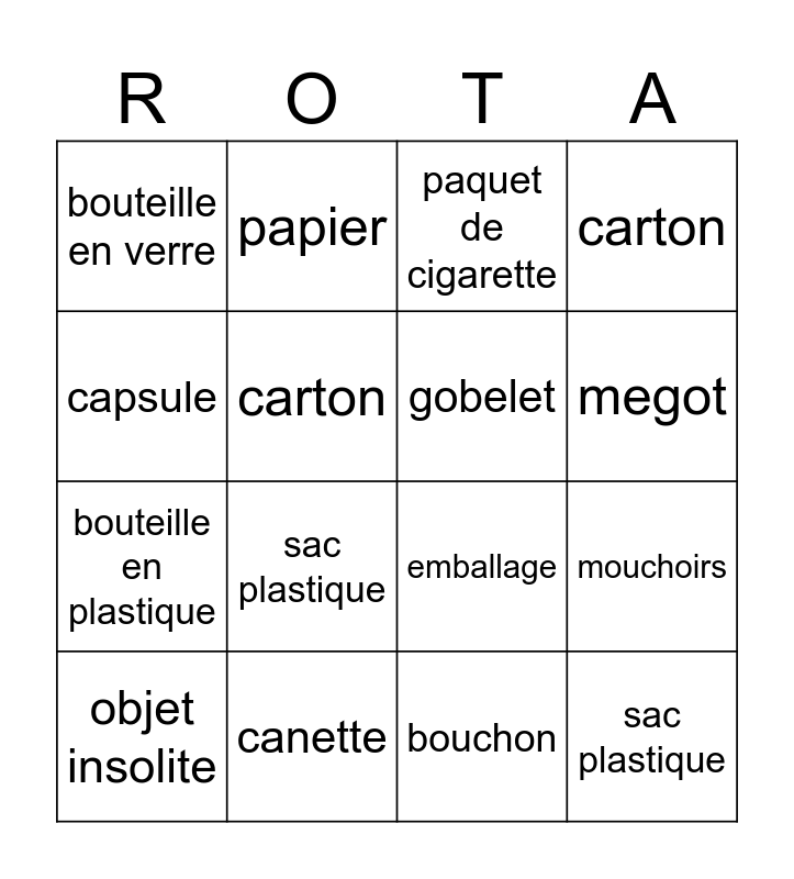 This bingo card has 16 words: canette, mouchoirs, paquet de cigarette, bouteille en verre, bouteille en plastique, papier, emballage, bouchon, capsule, carton, objet insolite, carton, sac plastique, megot, gobelet and sac plastique.