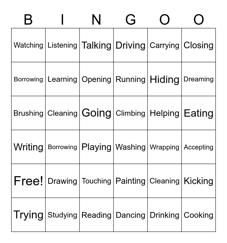 This bingo card has 42 words: Writing, Cleaning, Hurting, Driving, Helping, Accepting, Borrowing, Calling, Talking, Running, Hiding, Dreaming, Watching, Learning, Reading, Climbing, Drinking, Eating, Free!, Listening, Opening, Painting, Wrapping, Closing, Trying, Studying, Playing, Discussing, Cleaning, Cooking, Swimming, Drawing, Going, Washing, Teaching, Kicking, Brushing, Borrowing, Touching, Dancing, Carrying and Running.