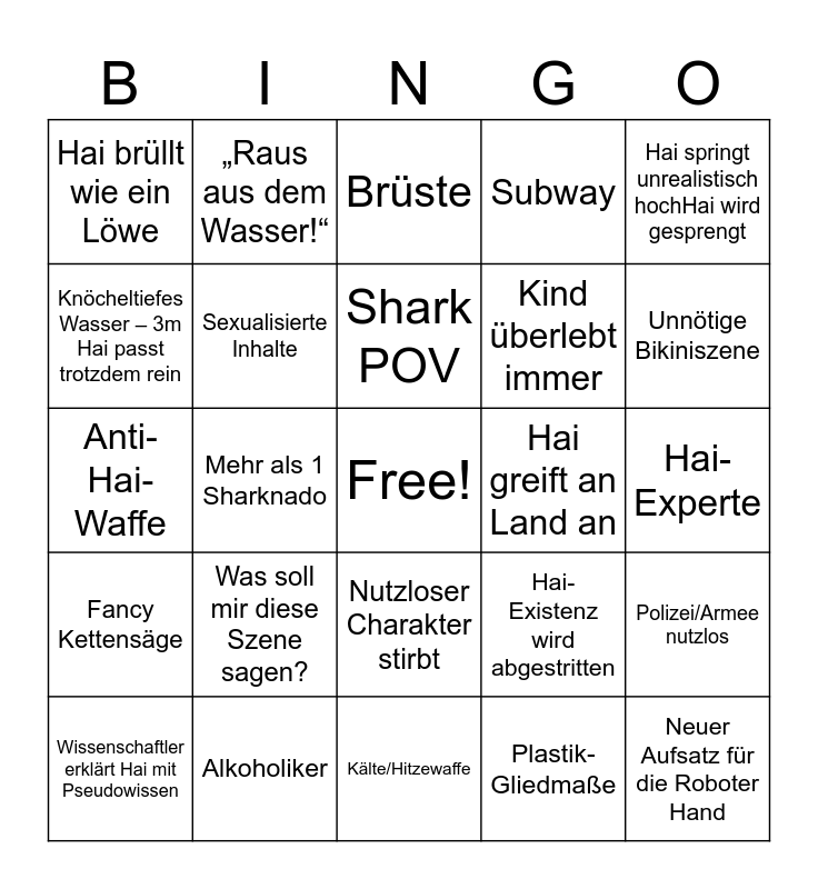 This bingo card has a free space and 24 words: Was soll mir diese Szene sagen?, Alkoholiker, Shark POV, Wissenschaftler erklärt Hai mit Pseudowissen, Hai springt unrealistisch hochHai wird gesprengt, Hai brüllt wie ein Löwe, Knöcheltiefes Wasser – 3m Hai passt trotzdem rein, „Raus aus dem Wasser!“, Hai greift an Land an, Nutzloser Charakter stirbt, Kind überlebt immer, Anti-Hai-Waffe, Hai-Existenz wird abgestritten, Polizei/Armee nutzlos, Sexualisierte Inhalte, Plastik-Gliedmaße, Hai-Experte, Brüste, Unnötige Bikiniszene, Mehr als 1 Sharknado, Neuer Aufsatz für die Roboter Hand, Fancy Kettensäge, Subway and Kälte/Hitzewaffe.