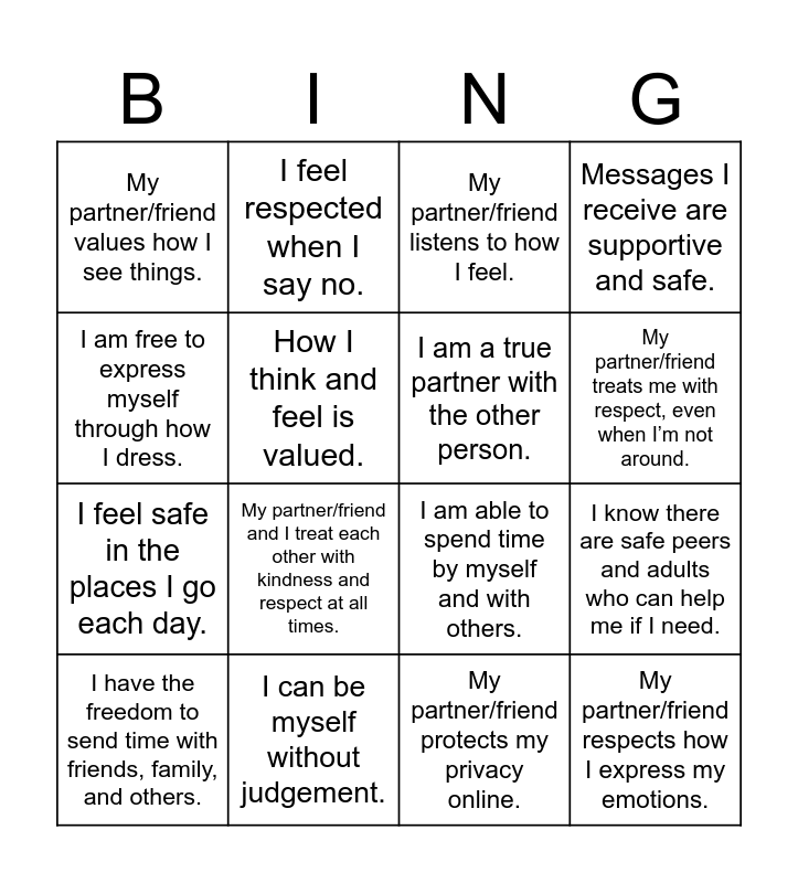 This bingo card has 22 words: I can be myself without judgement., When I disagree with someone, we still act with respect., I feel respected when I say no., I feel like my privacy is respected., How I think and feel is valued., I am a true partner with the other person., My partner/friend values how I see things., My partner/friend listens to how I feel., I am able to spend time by myself and with others., My partner/friend respects how I express my emotions., I feel safe in the places I go each day., Messages I receive are supportive and safe., I can speak honestly and openly., My partner/friend does not constantly check in on where I am or what I’m doing., My partner/friend protects my privacy online., My partner/friend takes accountability for their actions., I know there are safe peers and adults who can help me if I need., I have the freedom to send time with friends, family, and others., My partner/friend and I treat each other with kindness and respect at all times., I am free to express myself through how I dress., My partner/friend treats me with respect, even when I’m not around. and I trust how my partner acts online is the same as they are in person..