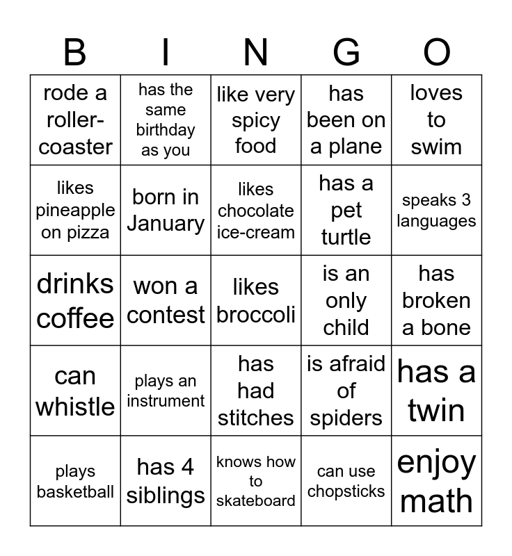 This bingo card has a free space and 29 words: plays basketball, visited Paris, won a contest, saw an elephant in the wild, rode a roller-coaster, like very spicy food, born in January, plays an instrument, is an only child, has 4 siblings, has broken a bone, enjoy math, knows how to skateboard, can use chopsticks, speaks 3 languages, has had stiches, has had stitches, can whistle, loves to swim, drinks coffee, is afraid of spiders, wakes up early, has a pet turtle, likes pineapple on pizza, has been on a plane, has the same birthday as you, has a twin, likes chocolate ice-cream and walks to school.